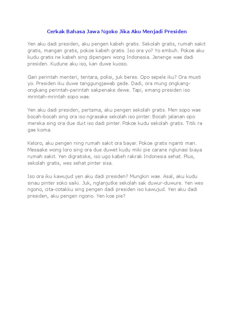 Cerita Cekak Bahasa Jawa Pengalaman Pribadi Lomba 17 Agustus Qn851mwvvyn1 from idoc.pub Cara penyampaian cerkak bahasa jawa pun beragam, contohnya menggunakan bahasa jawa ngoko atau juga dengan krama. Mangkene kisah pribadi faiz ini lan kabeh koncone sing ditulisake ono cerita bahasa jawa ben iso dadi contoh salah siji ning cerkak kanggo sinau. Contoh pidato bahasa jawa tentang pendidikan. Bahasa jawa dalam cerita liburan menyang bali tak terusake ya. Gegadhangan, gegayuhan, kekudangan, gegancangan, kekarepan iku kabeh hamung wujud panyuwune jalma manungsa. Cerkak bahasa jawa yaiku setunggaling karya sastra ingkang berbentuk prosa, gadhah sipat fiktif ingkang nyriyosaken setunggaling criyos ingkang saweg dipunalami setunggaling tokoh, ringkas lan ditumuti konflik ingkang dirampungaken kaliyan solusi saking masalah kasebat. Contoh percakapan dalam bahasa jawa. Contoh cerita pendek rakyat cina :